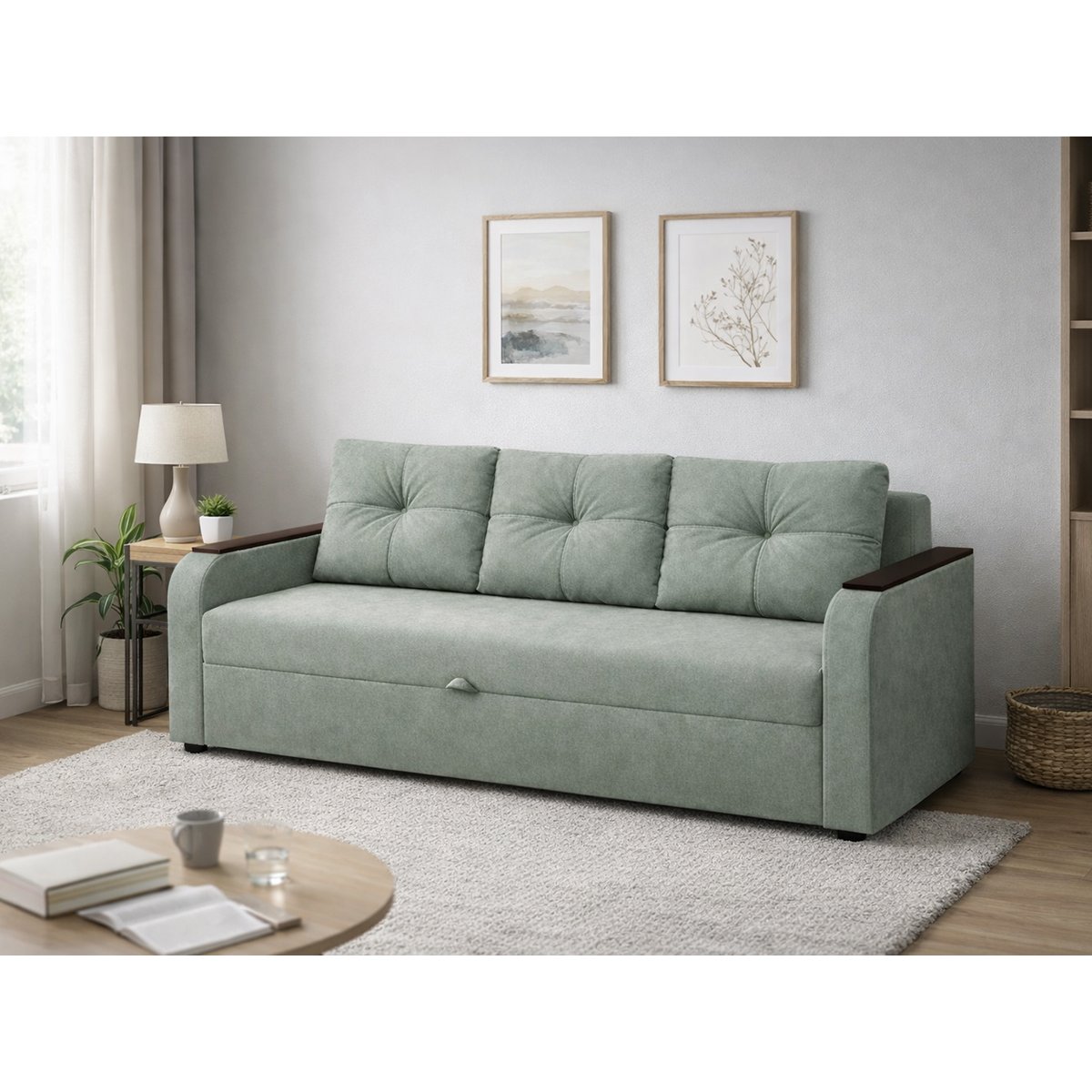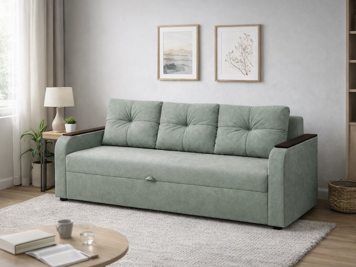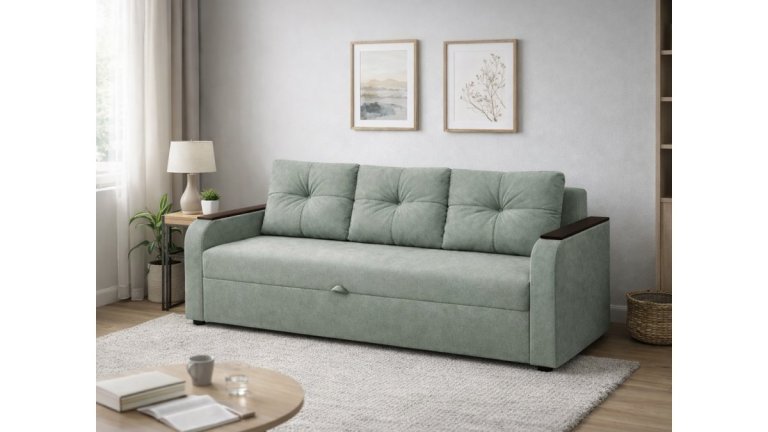Современный дизайн с декоративными подушками и МДФ‑накладками на подлокотниках оживит любую гостиную. Комфортный, практичный, готов к ежедневному использованию.