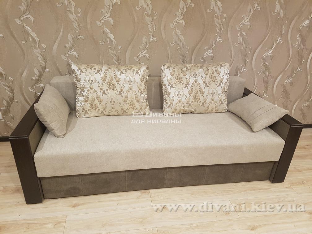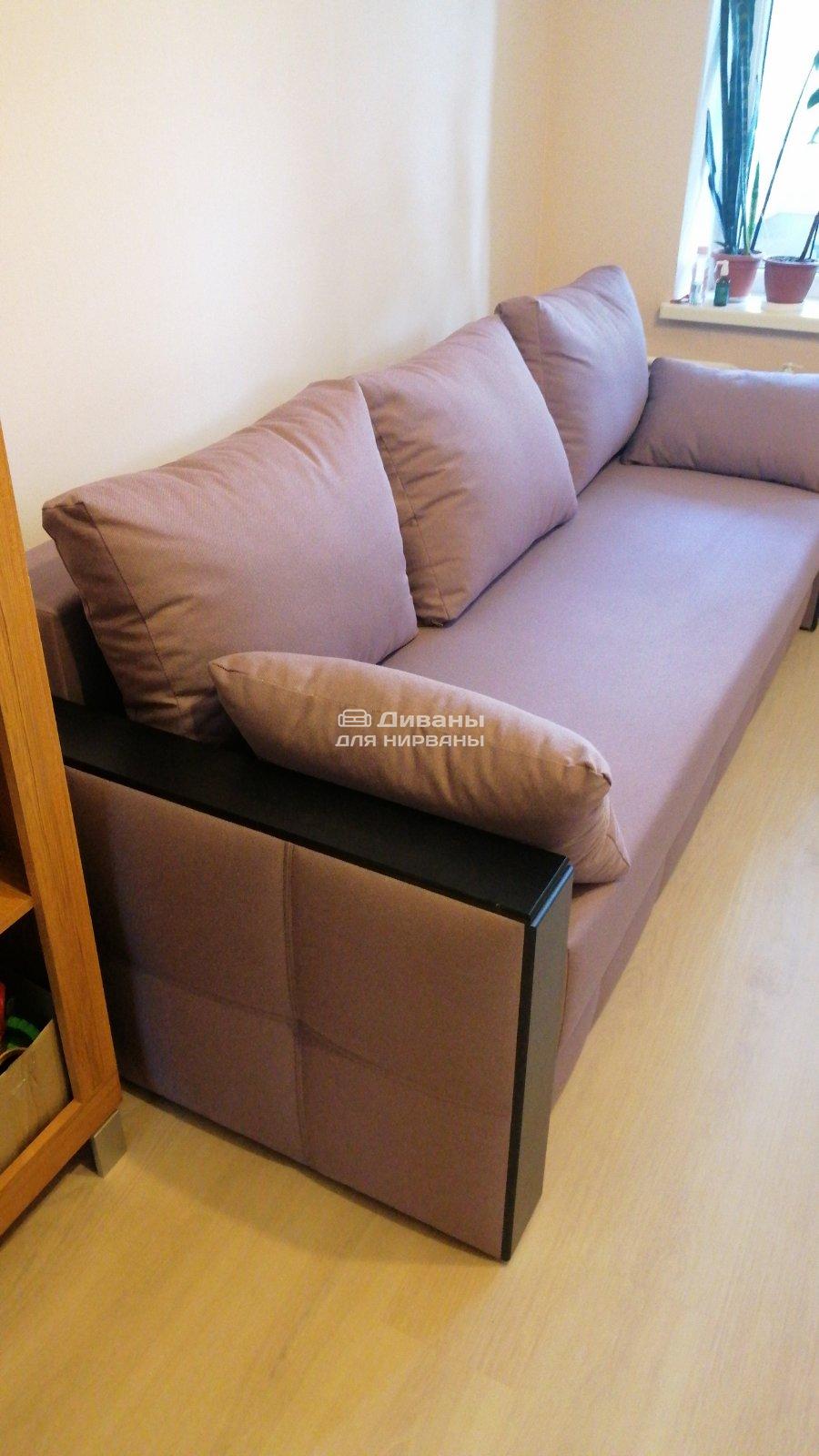 Диван хорошего качества. В меру жесткий. Деревянные накладки на подлокотниках придают дивану солидности. Покупкой остались очень довольны. Спасибо менеджеру Ирине!