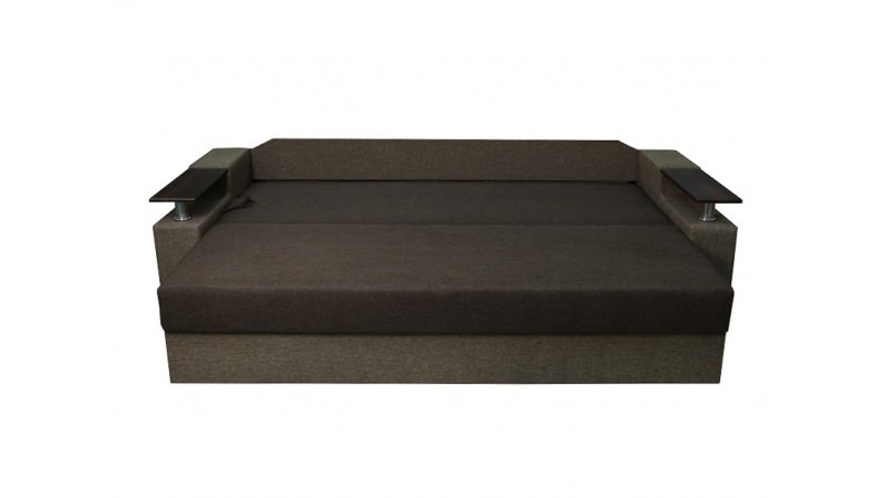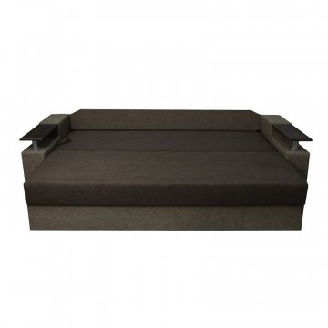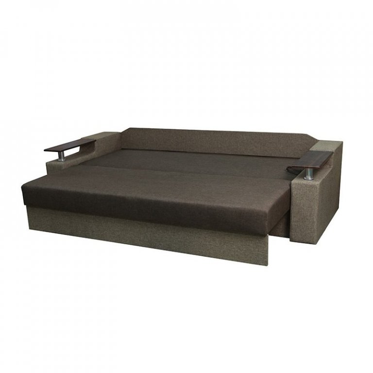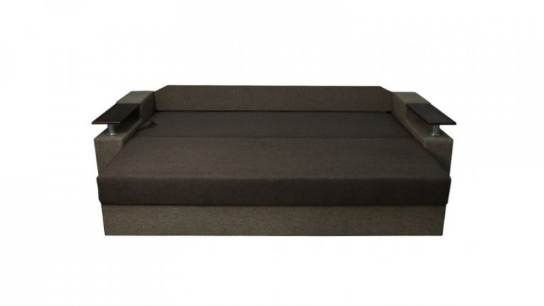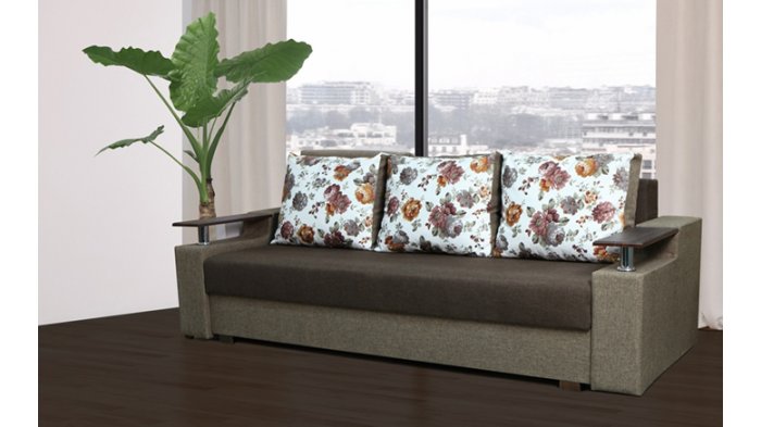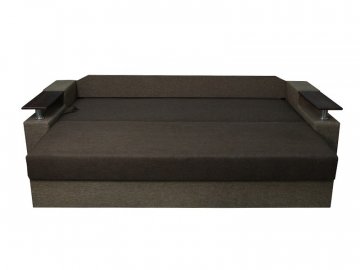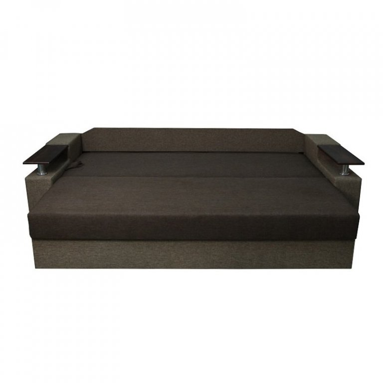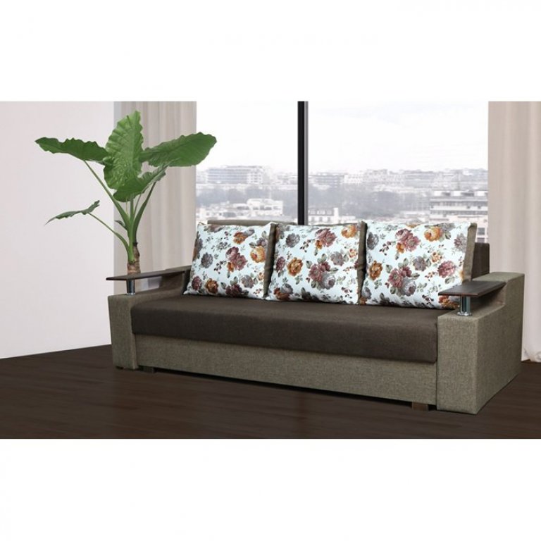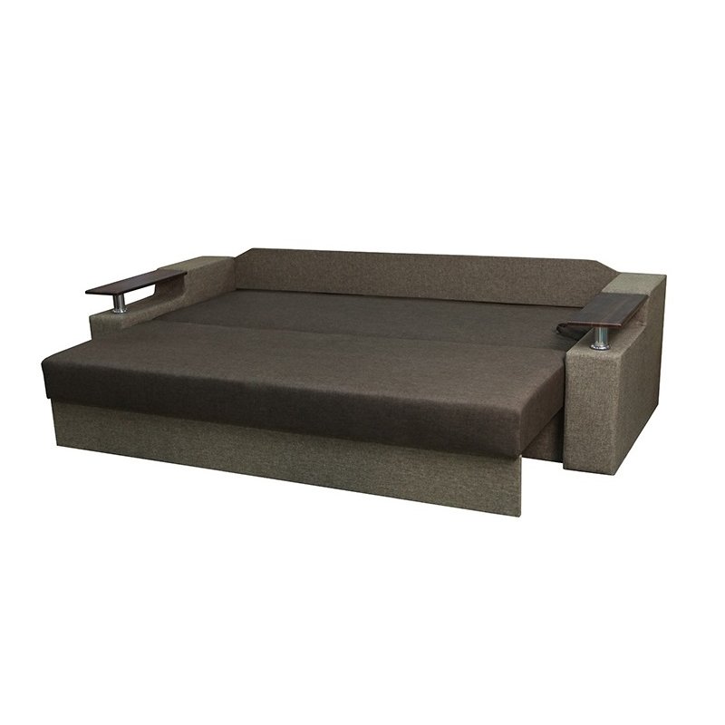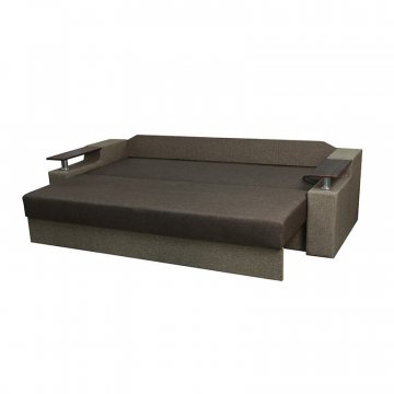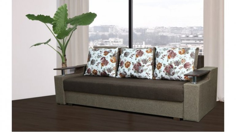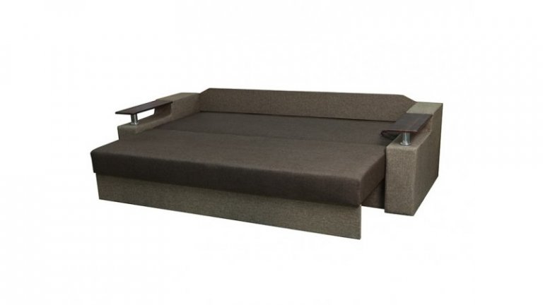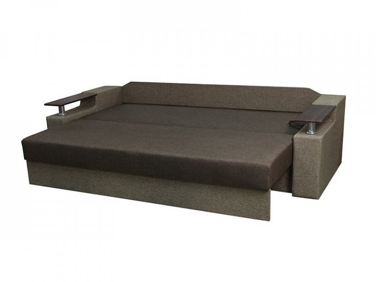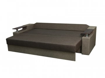 Идеальный вариант для гостиной: не занимает слишком много пространства, но при этом достаточно вместительный. Можно использовать как дополнительное спальное место, где свободно лягут двое взрослых людей. Раскладывается без особых усилий, благодаря современному прочному механизму «еврокнижка». Для приема гостей и просмотра фильмов пригодятся твердые накладки на подлокотники из МДФ. На них можно поставить напитки или закуски во время отдыха.