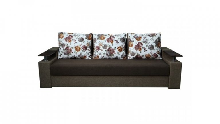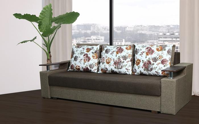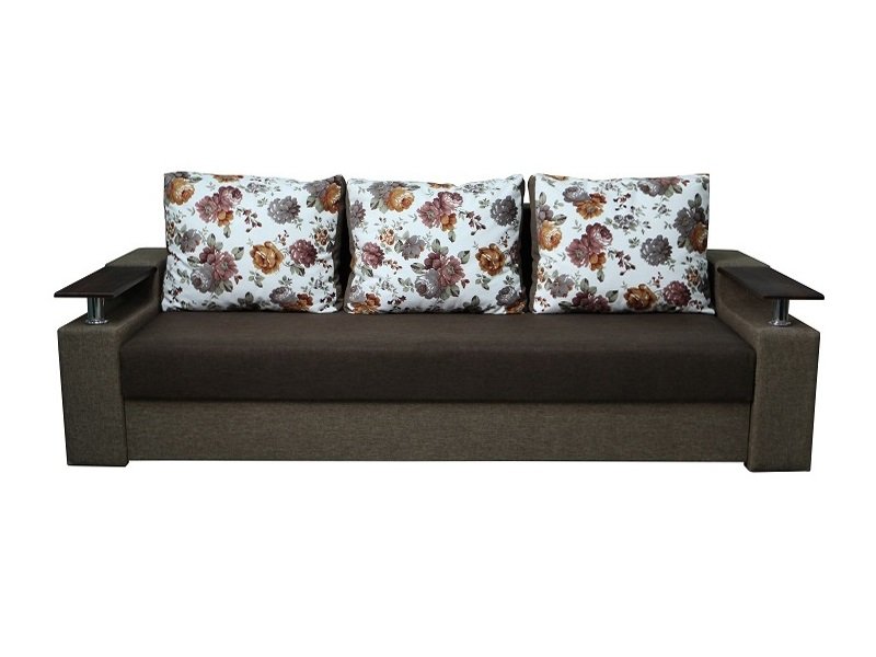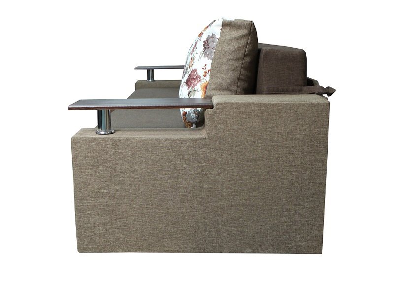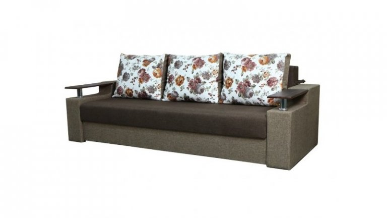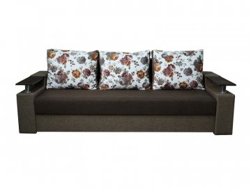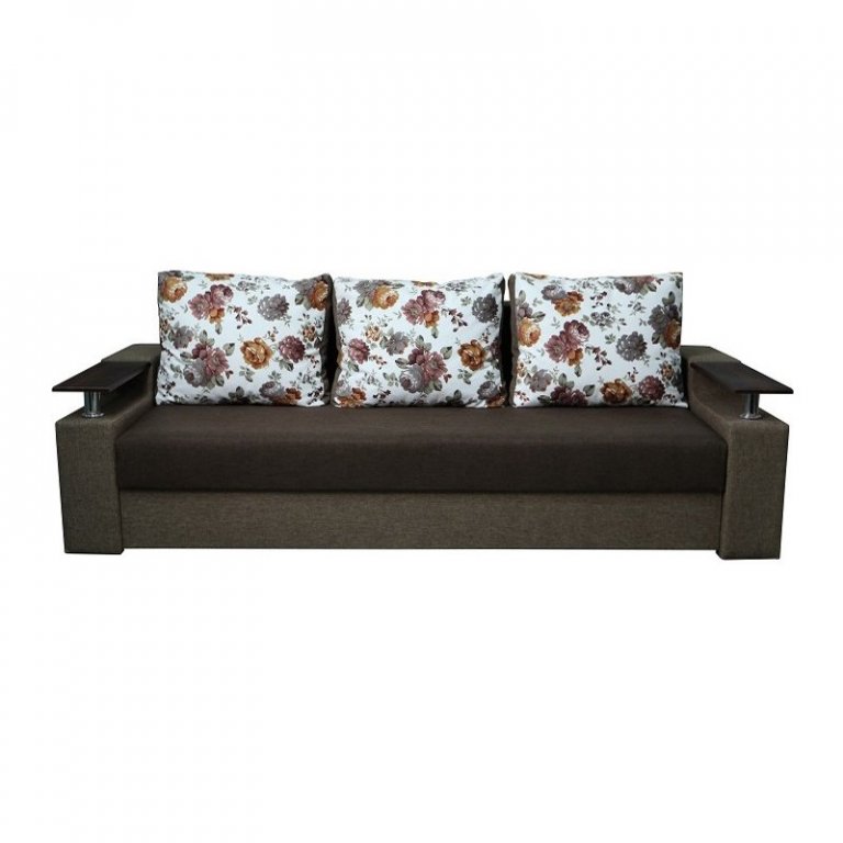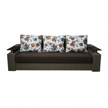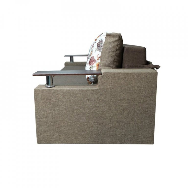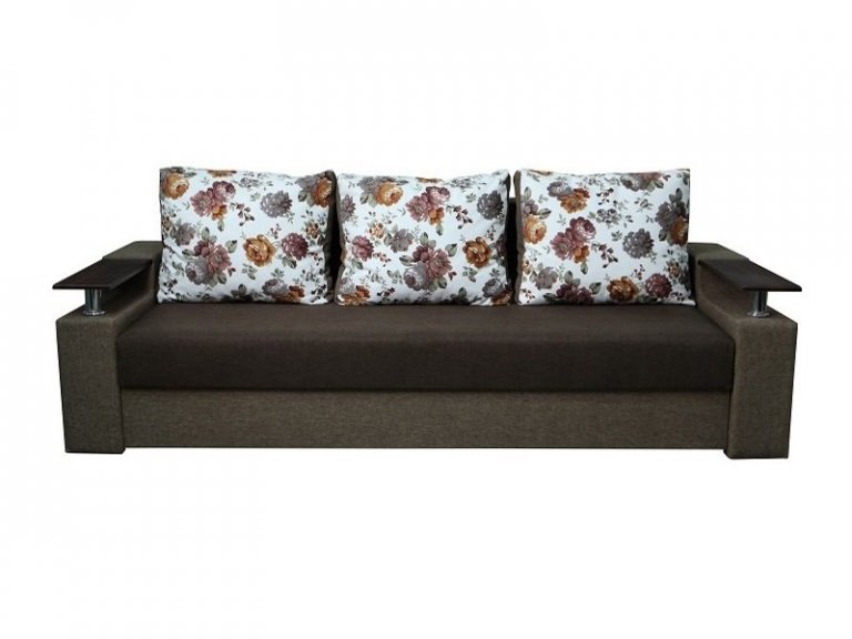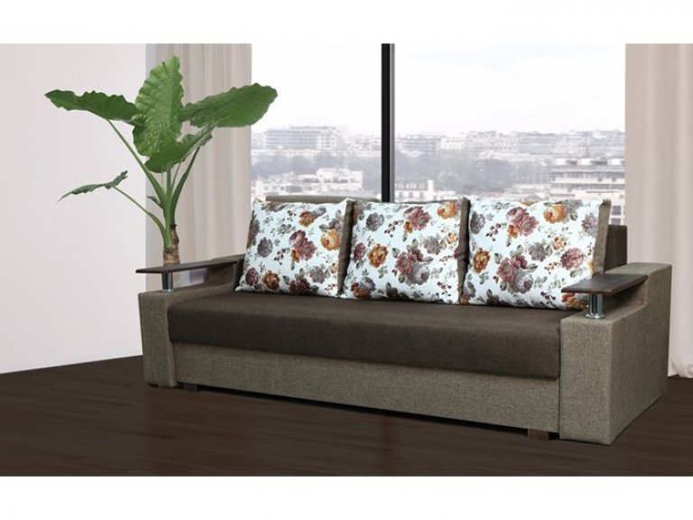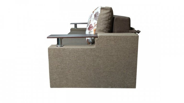 Идеальный вариант для гостиной: не занимает слишком много пространства, но при этом достаточно вместительный. Можно использовать как дополнительное спальное место, где свободно лягут двое взрослых людей. Раскладывается без особых усилий, благодаря современному прочному механизму «еврокнижка». Для приема гостей и просмотра фильмов пригодятся твердые накладки на подлокотники из МДФ. На них можно поставить напитки или закуски во время отдыха.