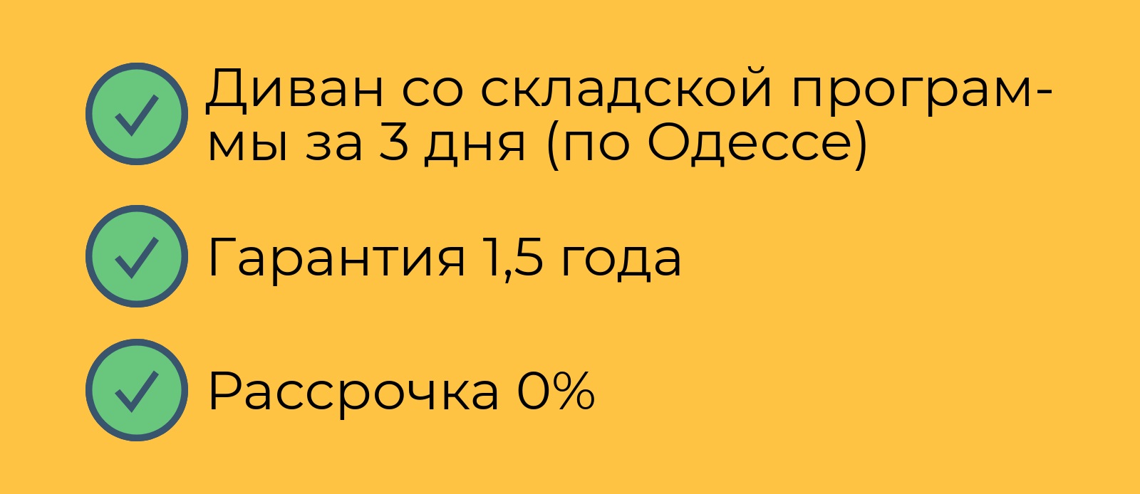 Бывает так, что понравившегося дивана нет в наличии. Тогда приходится заказывать его на фабрике и ждать. Обычно период производства и доставки занимает 2-3 недели. Мы понимаем насколько важно быстро получать необходимые вещи.