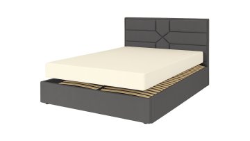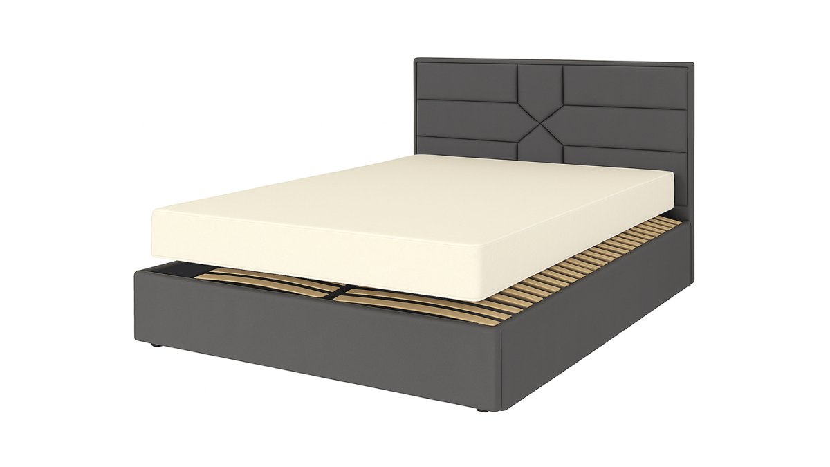В набор входит кровать «Мэри» размером 160×200 см. У неё есть ниша для хранения белья и подъёмный механизм — удобно и практично. Обита она серой тканью «Багира 18», которая не боится когтей домашних животных. Основание — крепкий металлический каркас с ламелями из бука.