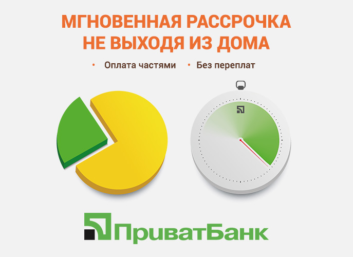 При выборе этой услуги, оформляется «мгновенная рассрочка». Проводится она онлайн по очень простым правилам. Для данного вида рассрочки достаточно иметь карточку Приватбанка «Универсальная», «Универсальная gold», «Platinum»), а полностью оформить ее можно прямо на сайте интернет-магазина, потратив всего несколько минут.