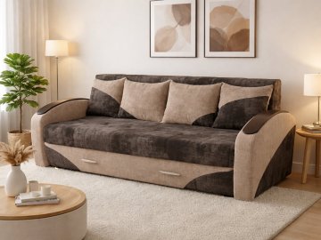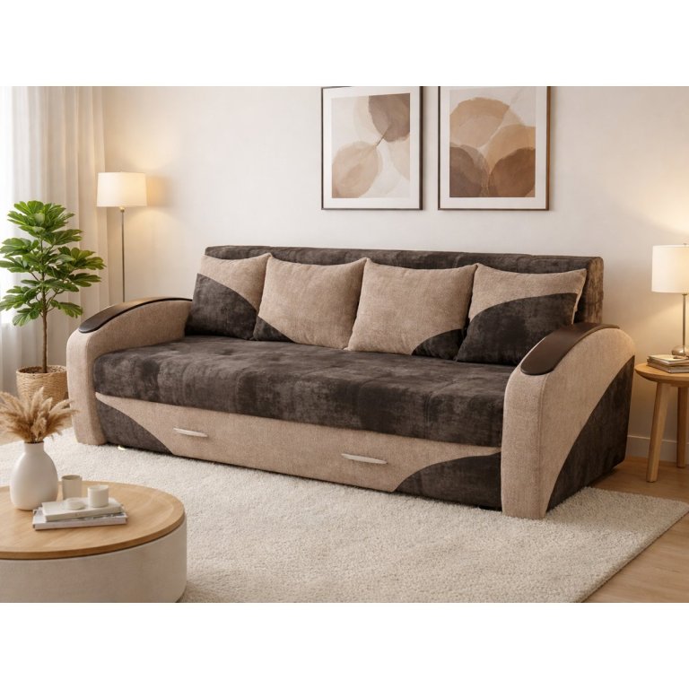У комплекті з диваном йдуть чотири декоративні подушки, які додають затишку вашому приміщенню. Підлокітники дивана мають форму напівкруга і накладки, а також у дивані є зручна ніша для зберігання білизни, що робить його ще більш практичним і зручним для використання в повсякденному житті.
