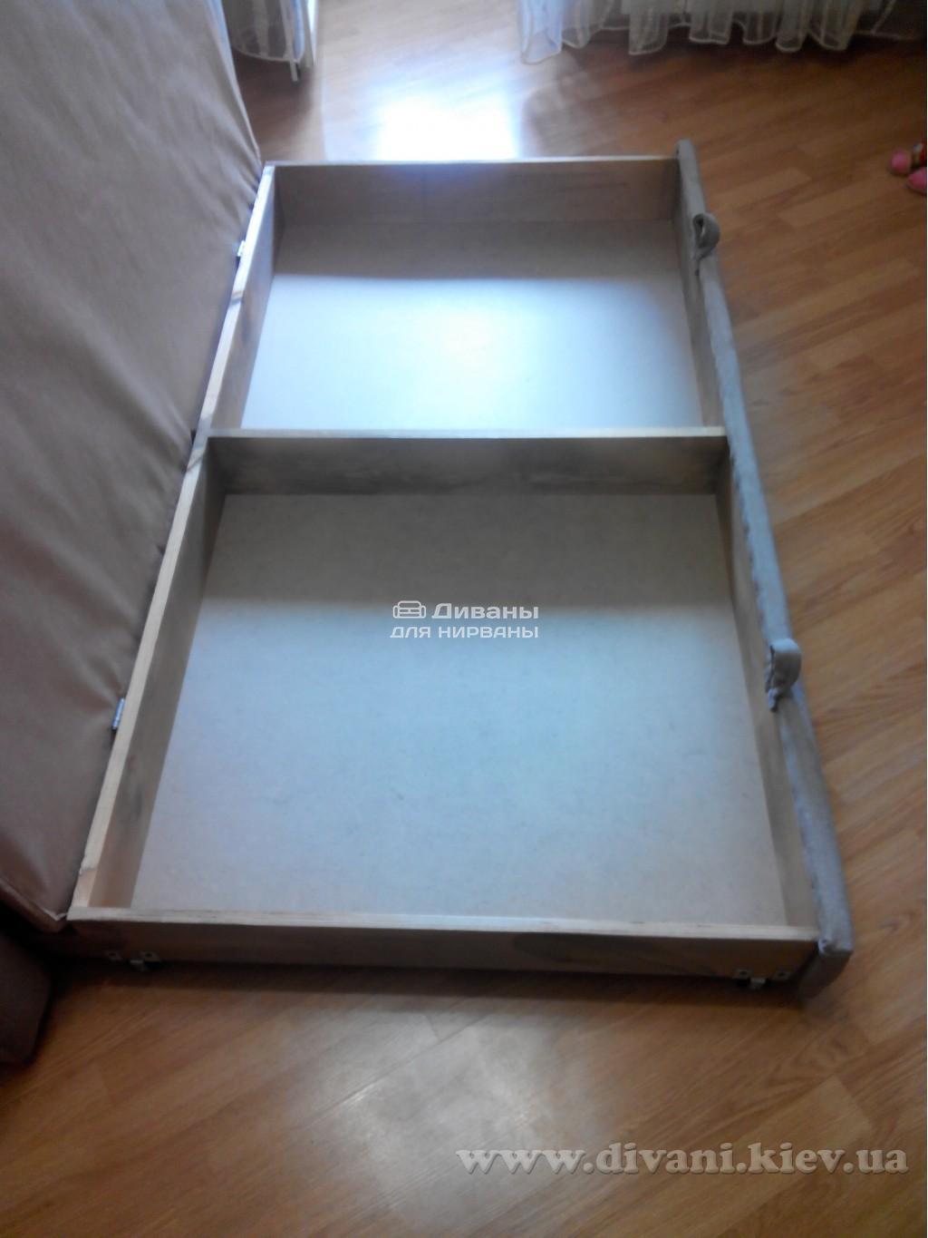 У даній моделі присутні білизняні ящики. Причому вони закриті спеціальним листом фанери, що перешкоджає проникненню пилу, допомагаючи речам залишатися чистими. Диван виготовлений з екологічно безпечних матеріалів, тому може використовуватися і в дитячій кімнаті. Малюкам сподобаються його великі знімні подушки і невисокі підлокітники. Та й батьки будуть спокійні за безпеку і зручність своїх дітей.